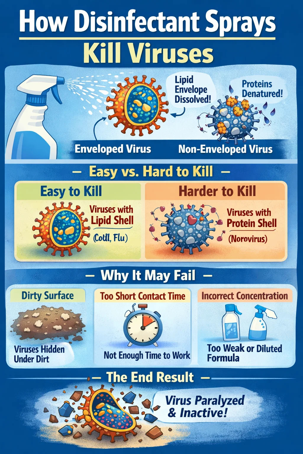 Štruktúra vírusu je v skutočnosti veľmi jednoduchá, zvyčajne pozostáva z kúska genetického materiálu a ochranného vonkajšieho obalu. Dezinfekčné spreje primárne deaktivujú vírusy dvoma spôsobmi: