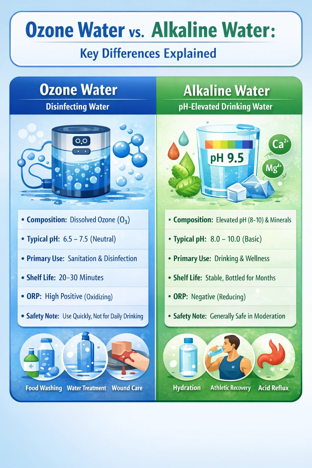 Ozónová voda a alkalická voda sú odlišné produkty s rôznymi chemickými vlastnosťami, rôznymi aplikáciami a rôznymi dôkazovými základňami. Ozónová voda je silný dezinfekčný prostriedok s krátkou životnosťou, ktorý sa najlepšie používa na hygienické úlohy – umývanie potravín, ošetrenie povrchov a čistenie vody. Alkalická voda je produkt pitnej vody so zvýšeným pH so skromnými a stále diskutovanými výhodami súvisiacimi s hydratáciou a riadením kyslého refluxu.